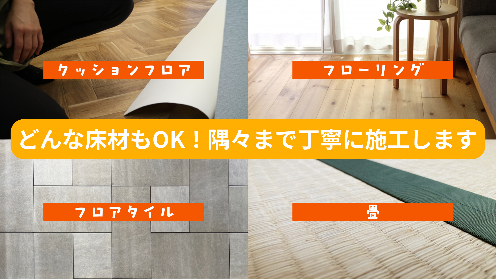 フローリング、クッションフロア、カーペット、タイルカーペットなど幅広く対応可能です。ペット向けや傷・汚れに強い床材もご用意しています。現地でご要望をお聞かせください。
